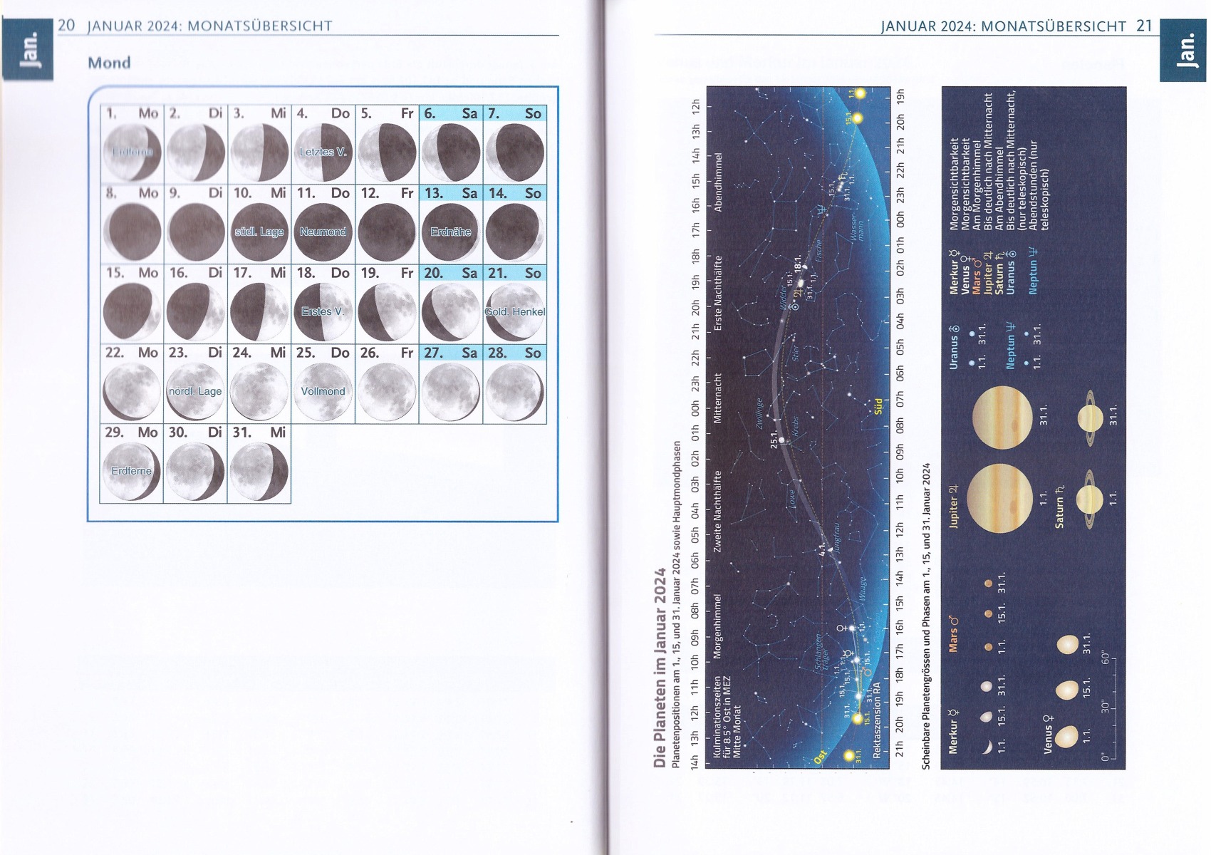 Sehr praktisch ist bei jeder Monatsübersicht der Astrokalender, wo für jede Nacht die wichtigsten Ereignisse in ihrer zeitlichen Reihenfolge aufgelistet sind.