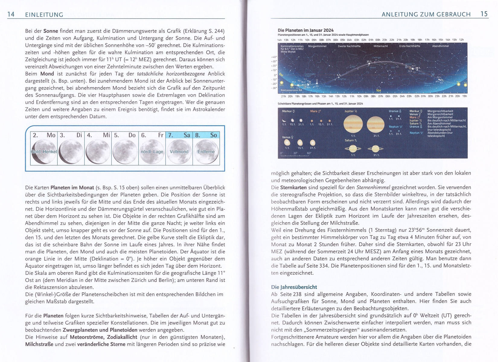 Der Sternenhimmel 2024 bietet dem Hobby-Astronomen besonders detaillierte und präzise Informationen zu den Geschehnissen am Himmel. Neben umfangreichen Angaben zur Beobachtung von Sonne, Mond und Planeten finden Sternfreunde Aufsuchkarten für Kleinplaneten sowie Informationen zum Verlauf von Sternbedeckungen durch den Mond, zu Kometen, veränderlichen Sternen und vielem mehr.
