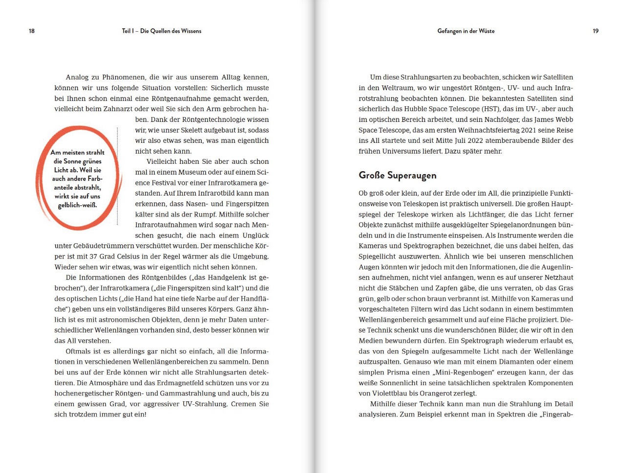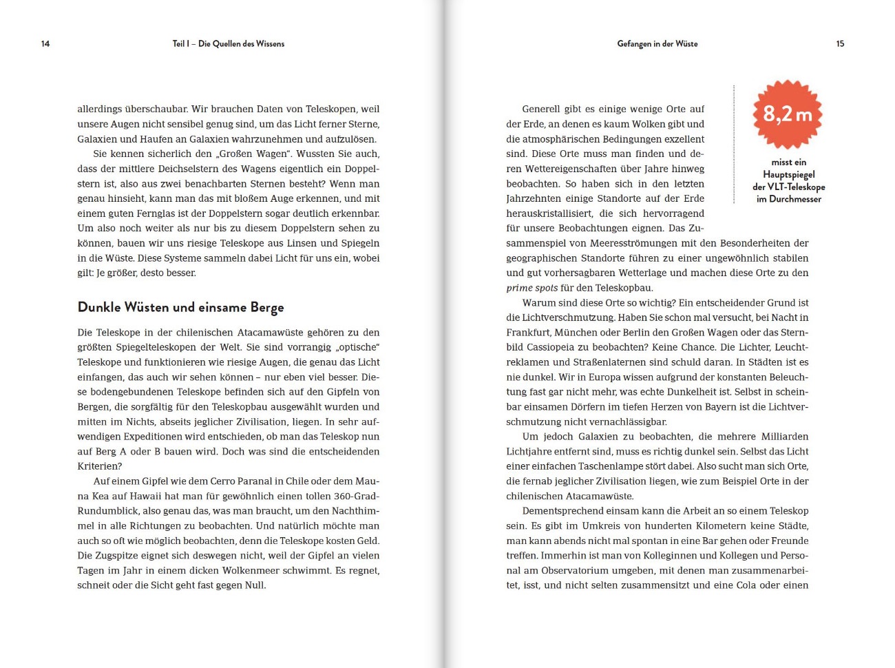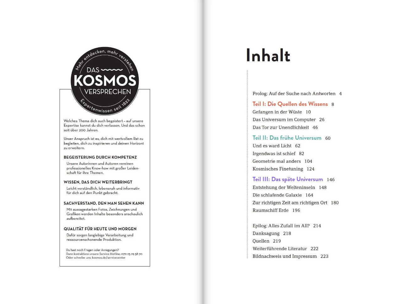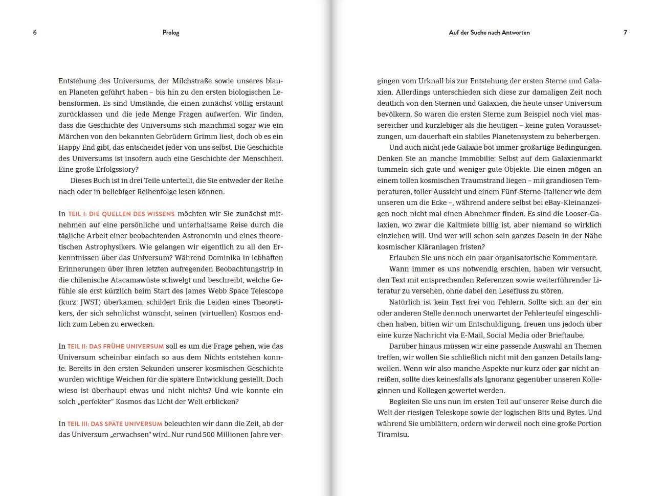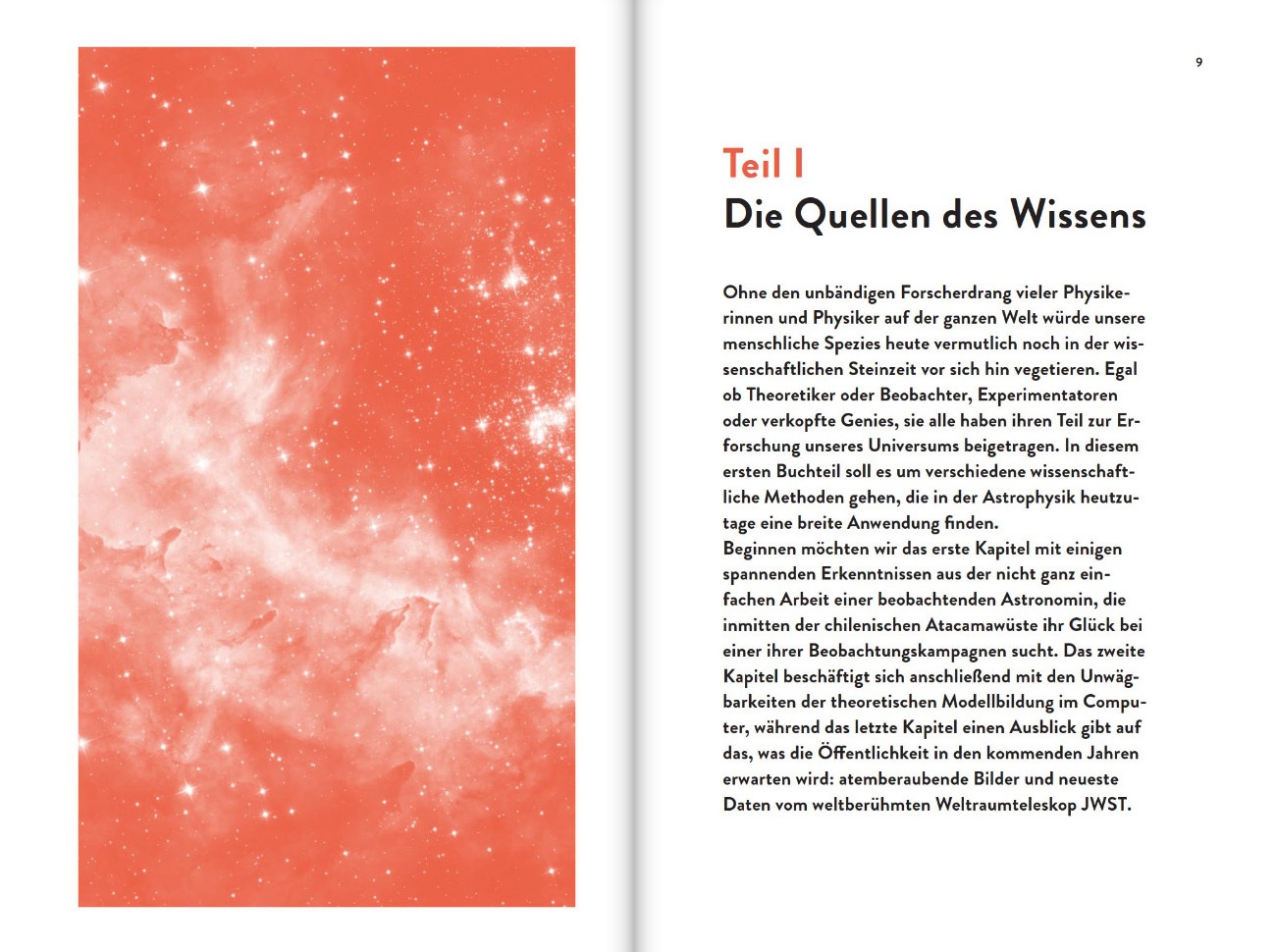 Das Buch ist in 3 Teile unterteilt „Teil 1: Die Quellen des Wissens“, „Teil 2: Das frühe Universum“ und „Teil 3: Das späte Universum“ welche man der Reihe nach oder in beliebiger Reihenfolge lesen kann, da die einzelnen Teile in sich abgeschlossen sind.
